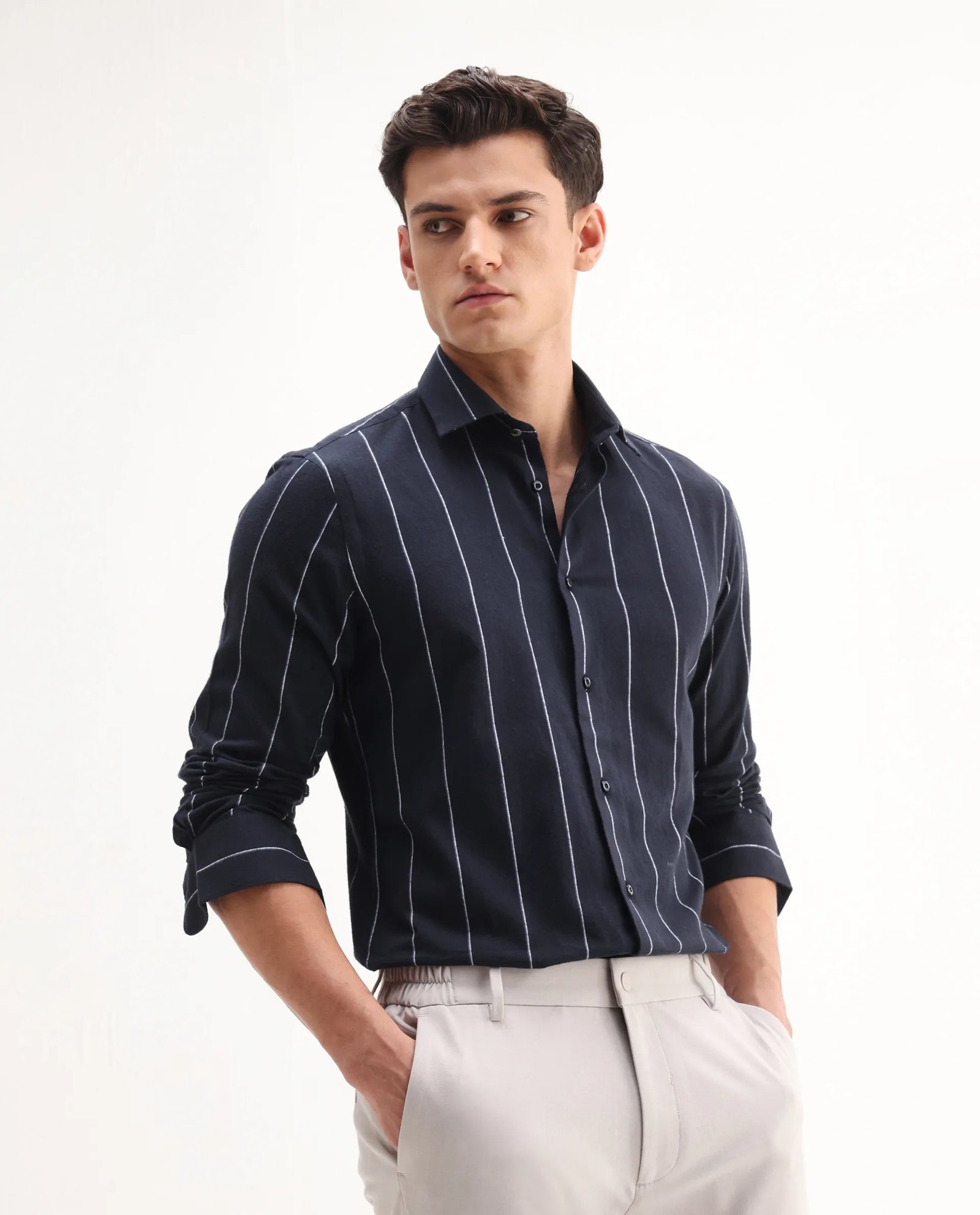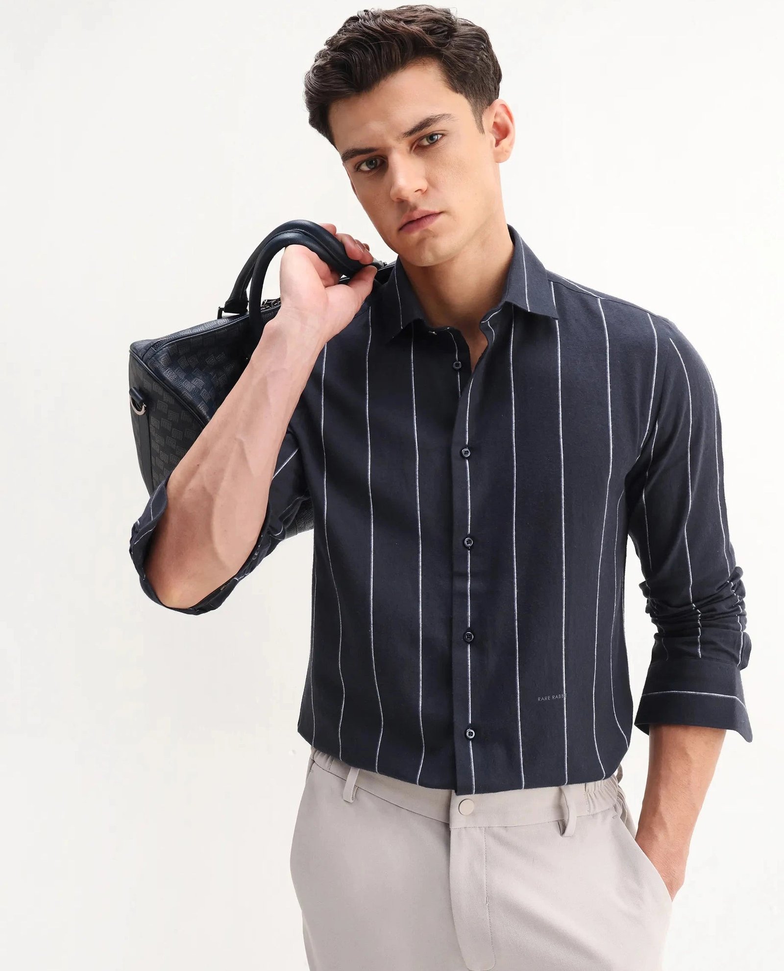 This Rare Rabbit men’s shirt features a full-sleeve design crafted from premium navy cotton fabric. ensuring comfort and breathability. The collared neck and subtle stripes add a refined touch. making it suitable for both formal and casual occasions. Its tailored fit offers a polished silhouette. reflecting expert attention to detail and quality craftsmanship.