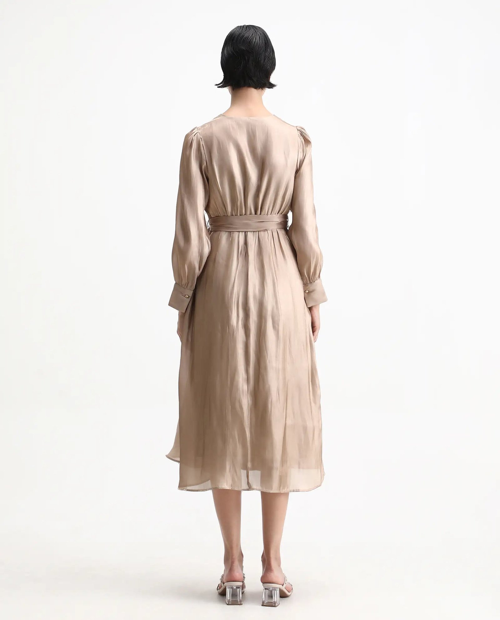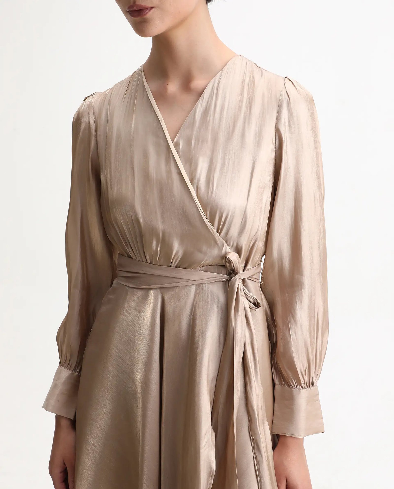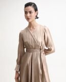 This Rareism Women Avsin Gold dress features a sophisticated wrap neck design and a flattering fit-and-flare silhouette. Crafted from polyester. it offers a smooth. comfortable feel and easy maintenance. The pull-on closure ensures effortless wear. while the midi length adds an elegant touch suitable for various occasions.